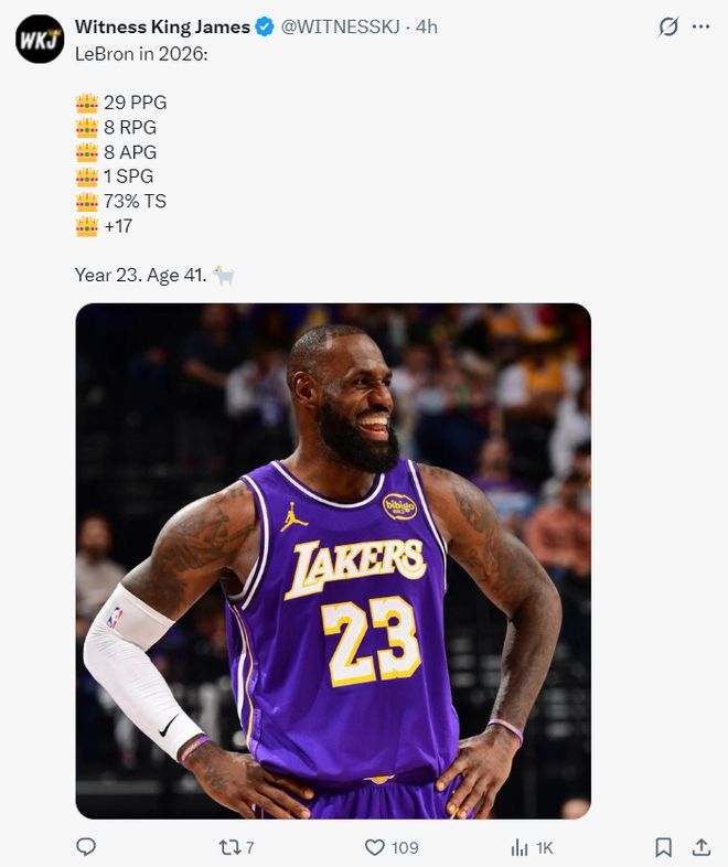进入2026年后,詹姆斯两场比赛场均29分8篮板8助攻1抢断,真实命中率73%,正负值+17,这四项数据出炉后湖人媒体再度盛赞勒布朗就是GOAT。