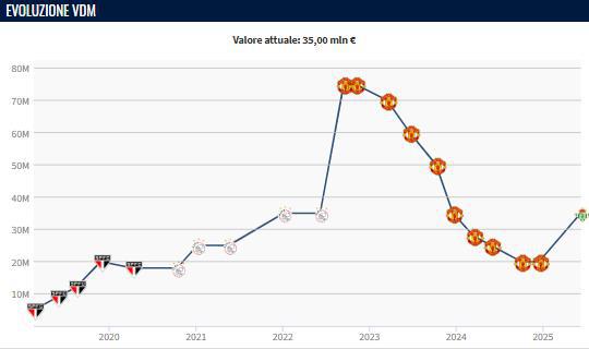 而在2022年11月-2024年10月,安东尼的身价经历7次下跌,最终跌至2000万欧元。